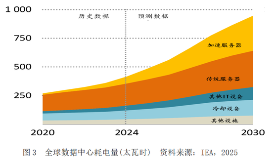 相比之下,IEA的估算更加接近图2的下限情景。根据IEA的估计,全球数据中心的耗电量将从2024年的415太瓦时(4150亿度)增至2030年的945太瓦时(9450亿度),如图3所示。